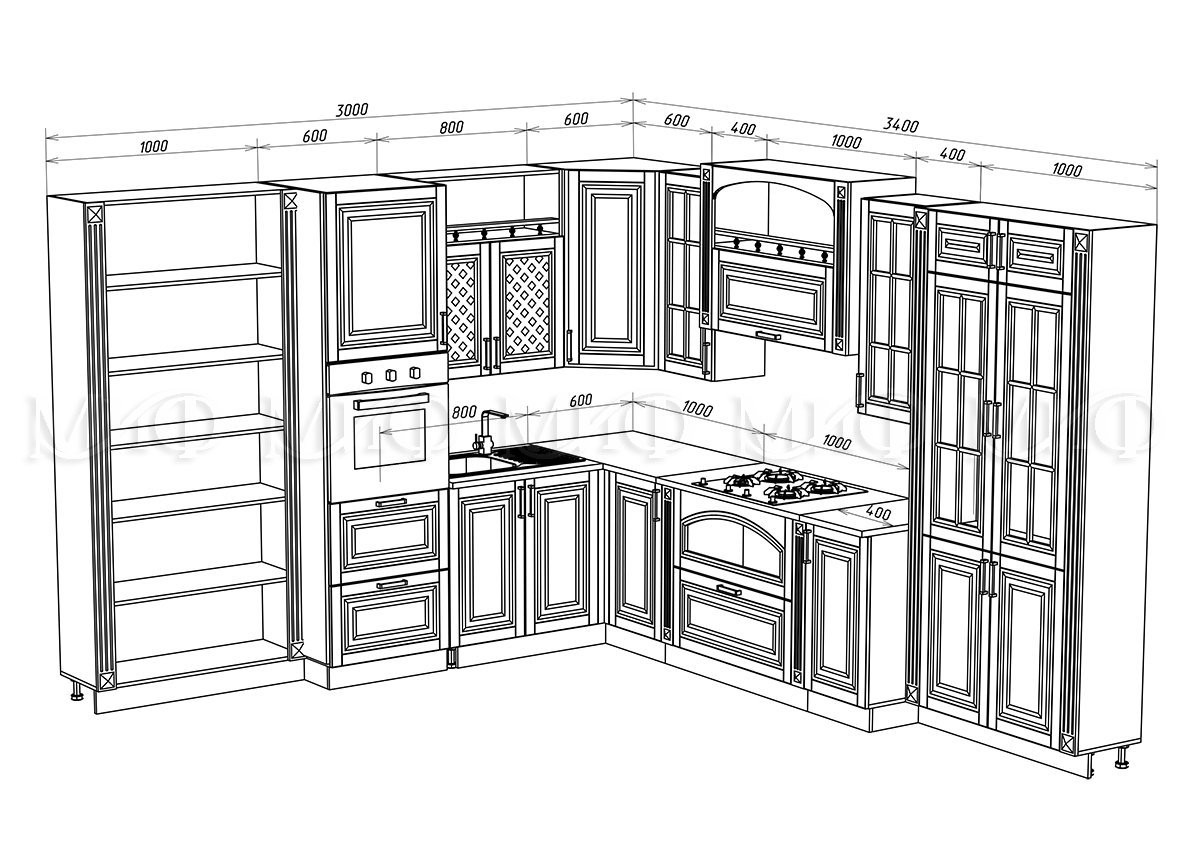 • Общие габариты Ширина 3000 х 3400 мм  x Глубина 600 (мм) по столешнице х Высота 850 (мм)