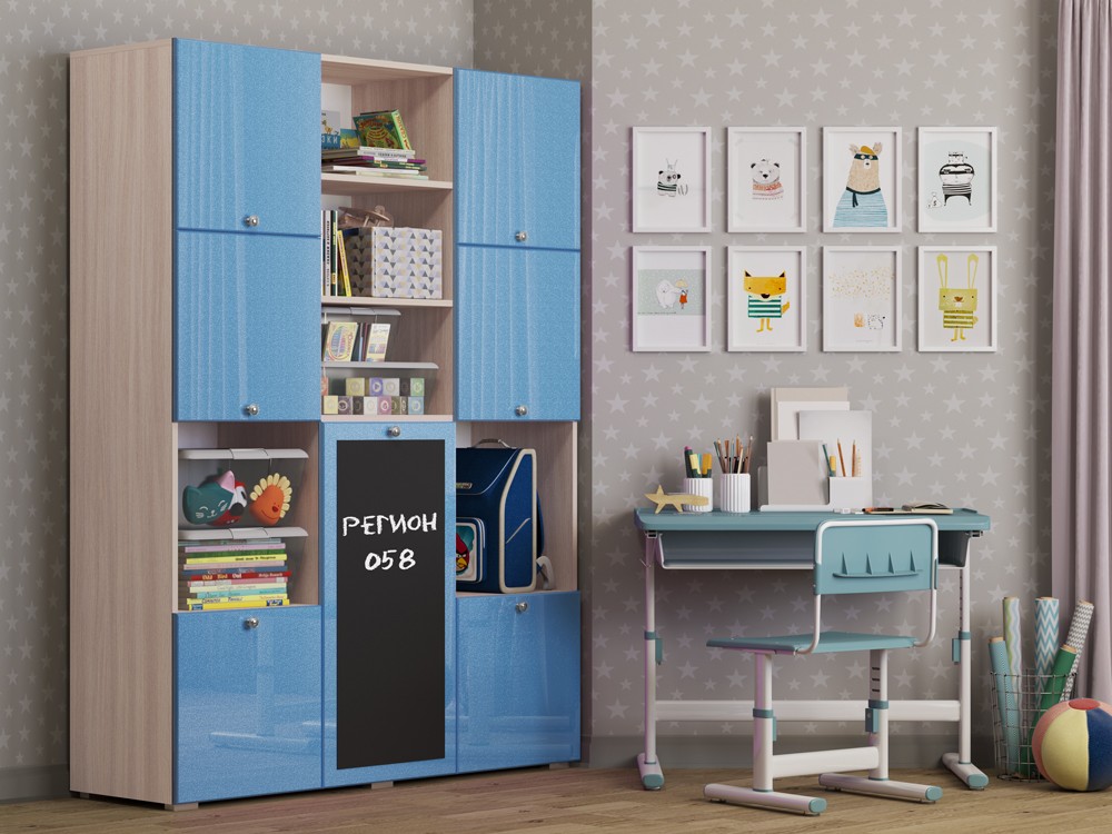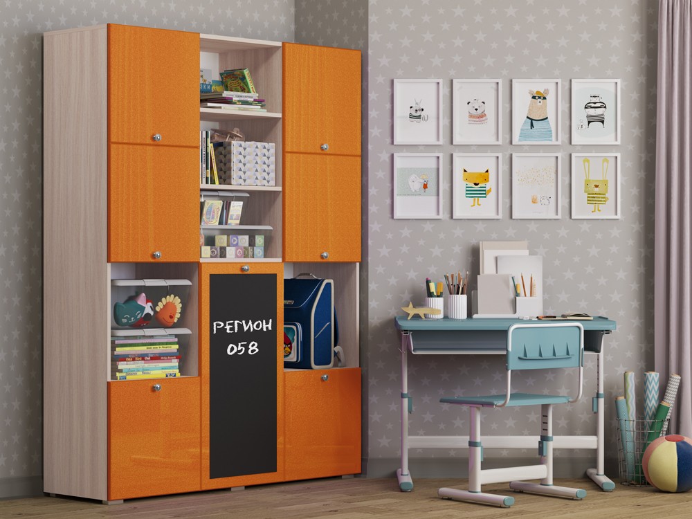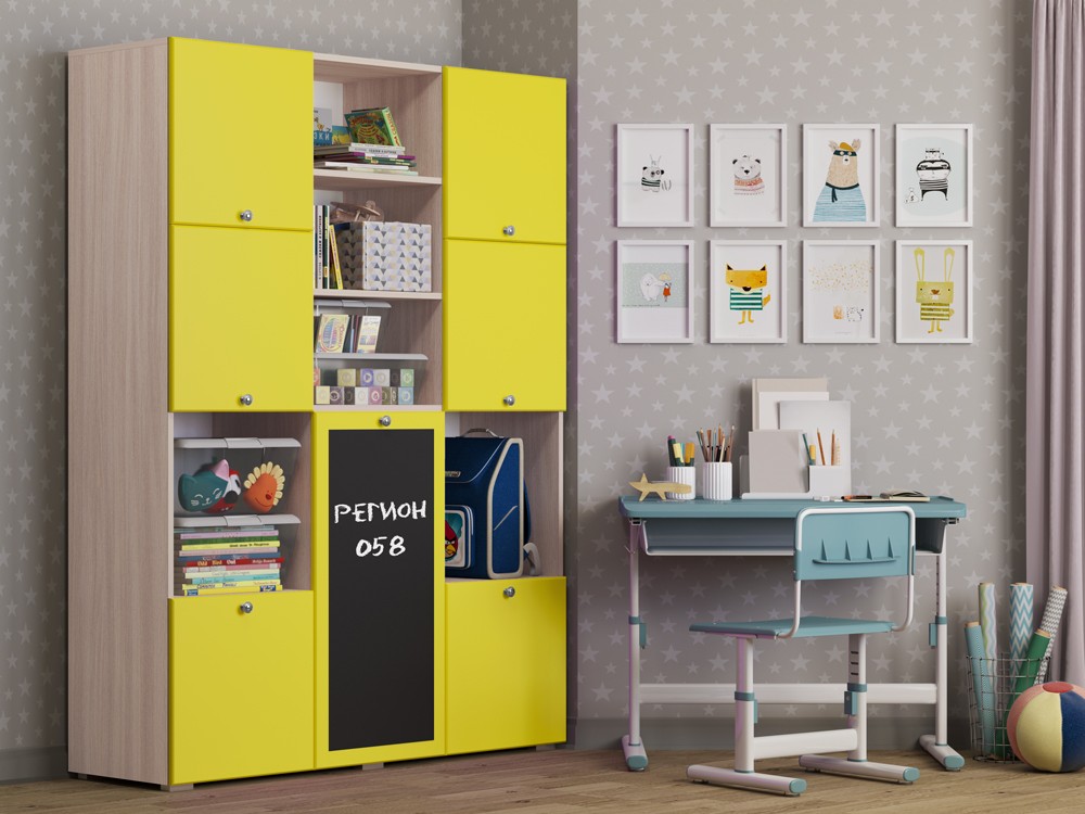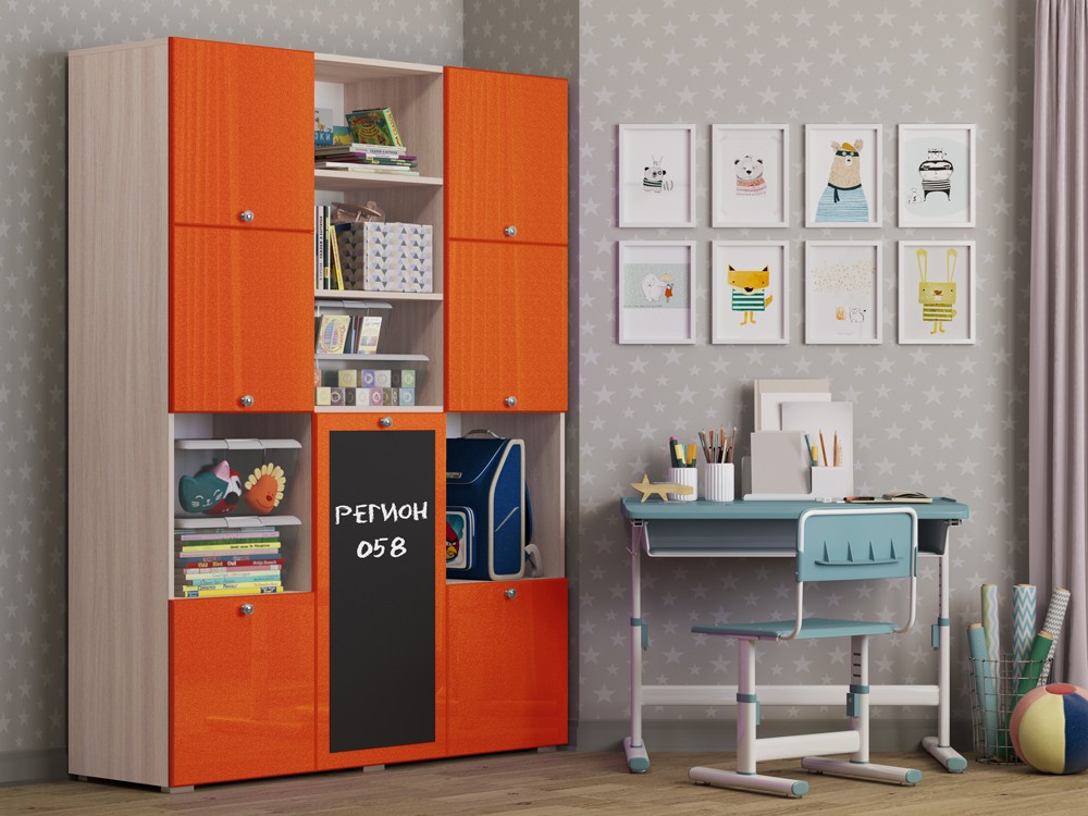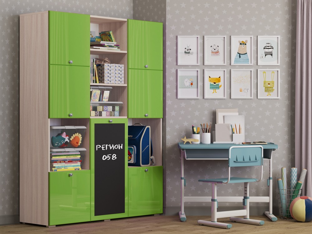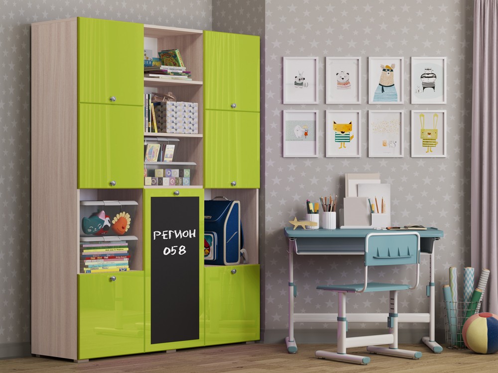 Необычный дизайн, хорошая вместимость шкафа, вешало для детской одежды, завершают образ изящные ручки-кнопки, которые не только красиво смотрятся в интерьере, но и отличаются удобством, долговечностью, безопасностью. Но главной и самой яркой изюминкой шкафа Юнга-11 служит доска для рисования. На ней можно рисовать как мелом, так и специальными маркерами, что позволит Вашему ребенку развивать свое творчество.